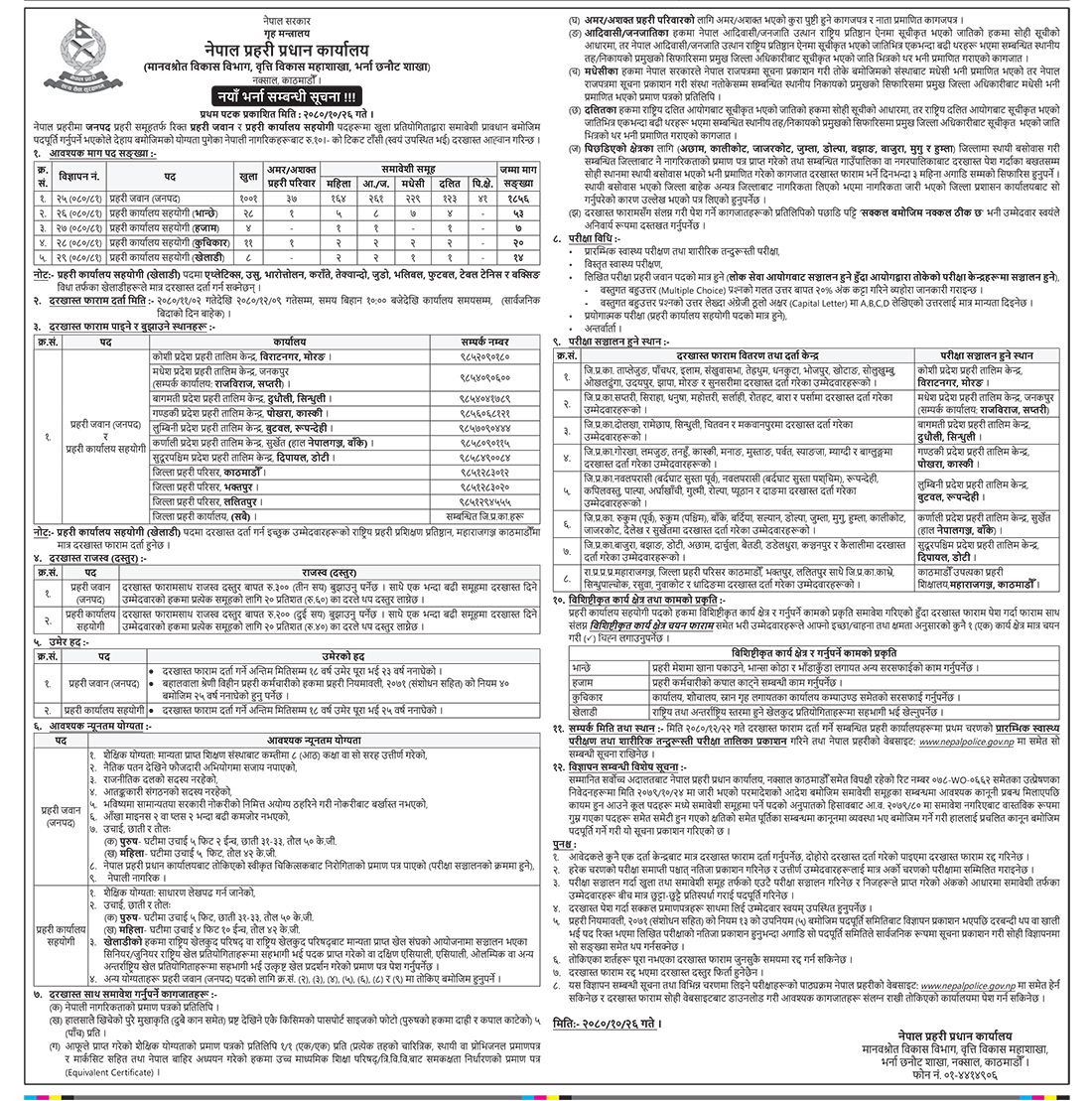 काठमाण्डु – नेपाल प्रहरीले ठूलो संख्यामा रिक्त पदपूर्तिका लागि आवेदन मागेको छ । नेपाल प्रहरी प्रधान कार्यालयले जनपद प्रहरी समूहतर्फ रिक्त प्रहरी जवान र प्रहरी कार्यालय सहयोगी पदहरूमा दरखास्त माग गरेको हो ।