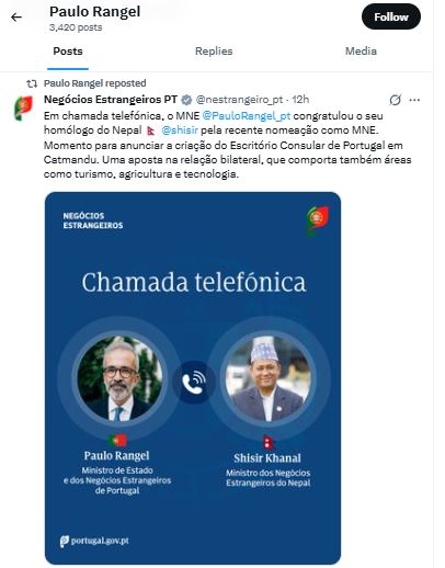 पोर्चुगलको विदेश मन्त्रालयले सामाजिक सञ्जाल एक्समा लेखेको छ, ‘फोन वार्तामा, विदेशमन्त्री पाउलो रंगेलले आफ्ना नेपाली समकक्षी शिशिर खनाललाई हालै परराष्ट्रमन्त्रीको रूपमा नियुक्त भएकोमा बधाई दिनुभयो । यो काठमाण्डुमा पोर्चुगलको कन्सुलर कार्यालय स्थापनाको घोषणा गर्ने अवसर पनि थियो । यो द्विपक्षीय सम्बन्धमा लगानी हो, जसमा पर्यटन, कृषि र प्रविधि जस्ता क्षेत्रहरू पनि समावेश छन् ।