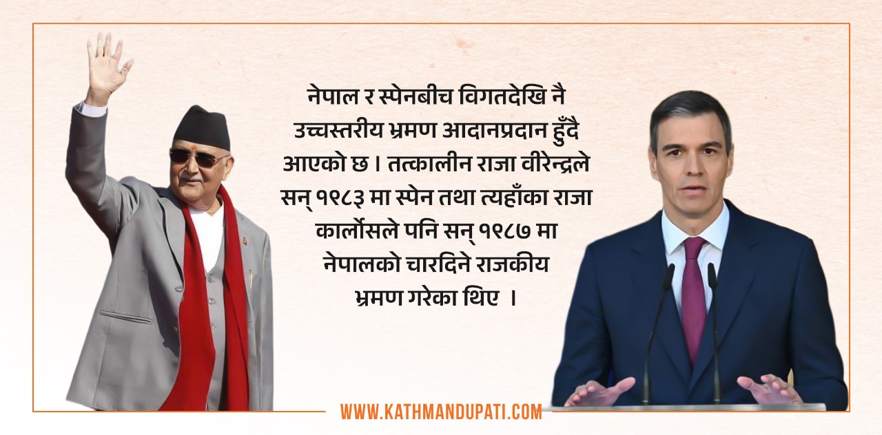 भ्रमणका क्रममा प्रधानमन्त्री ओलीले आफ्ना समकक्षीसँग द्विपक्षीय भेटवार्ता गर्नेछन् भने सहयोग र सम्बन्ध विस्तारसम्बन्धी केही महत्त्वपूर्ण विषयमा नेपाल र स्पेनबीच सहमतिपत्रमा हस्ताक्षर हुनेछ ।