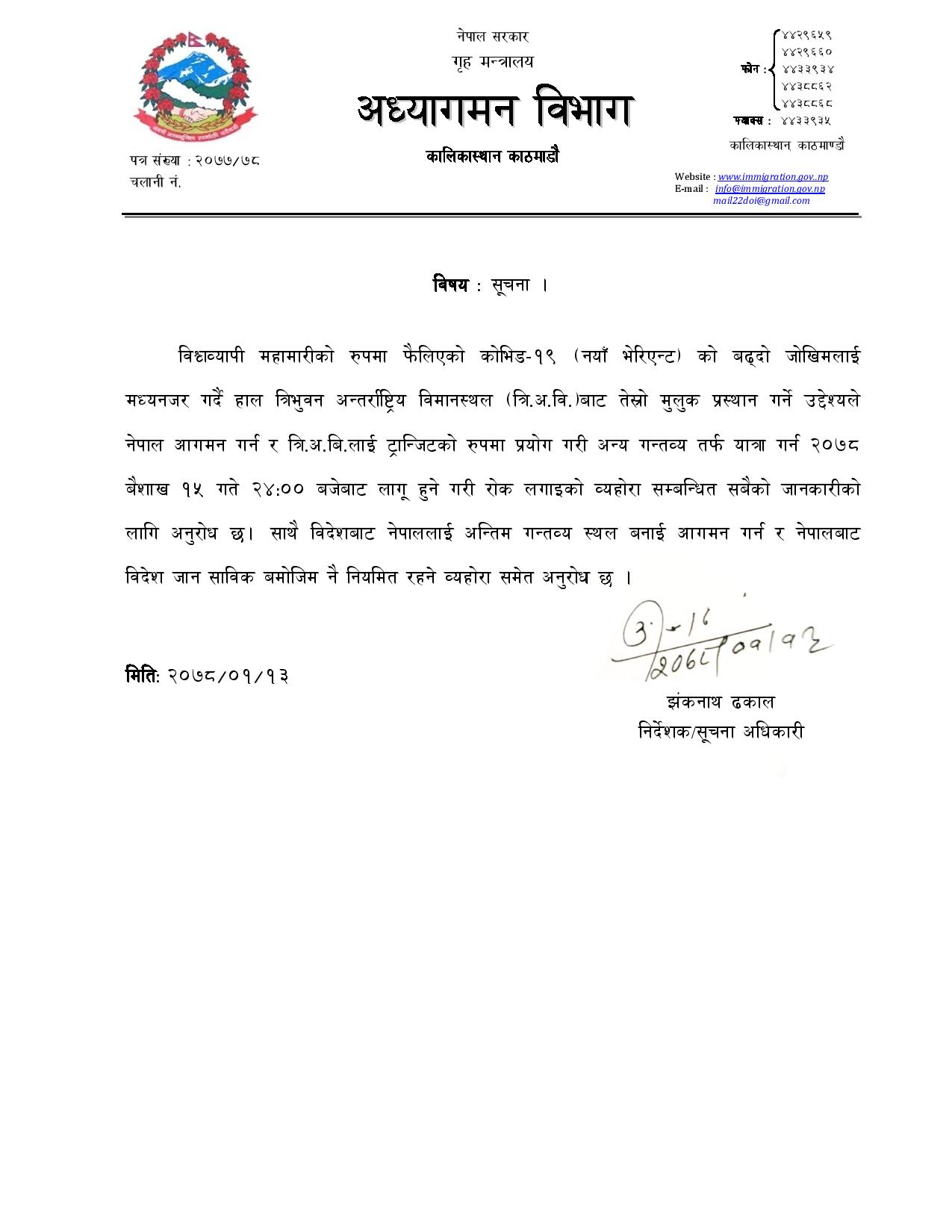 त्यस्तै त्रिभुवन अन्तराष्ट्रिय विमानस्थललाई ट्रान्जिट बनाई अन्य देश जानसमेत रोक लगाएको अध्यागमनका निर्देशक झंकनाथ ढकालले जानकारी दिए । उनकाअनुसार यो नियम वैशाख १५ गतेबाट लागू हुनेछ ।