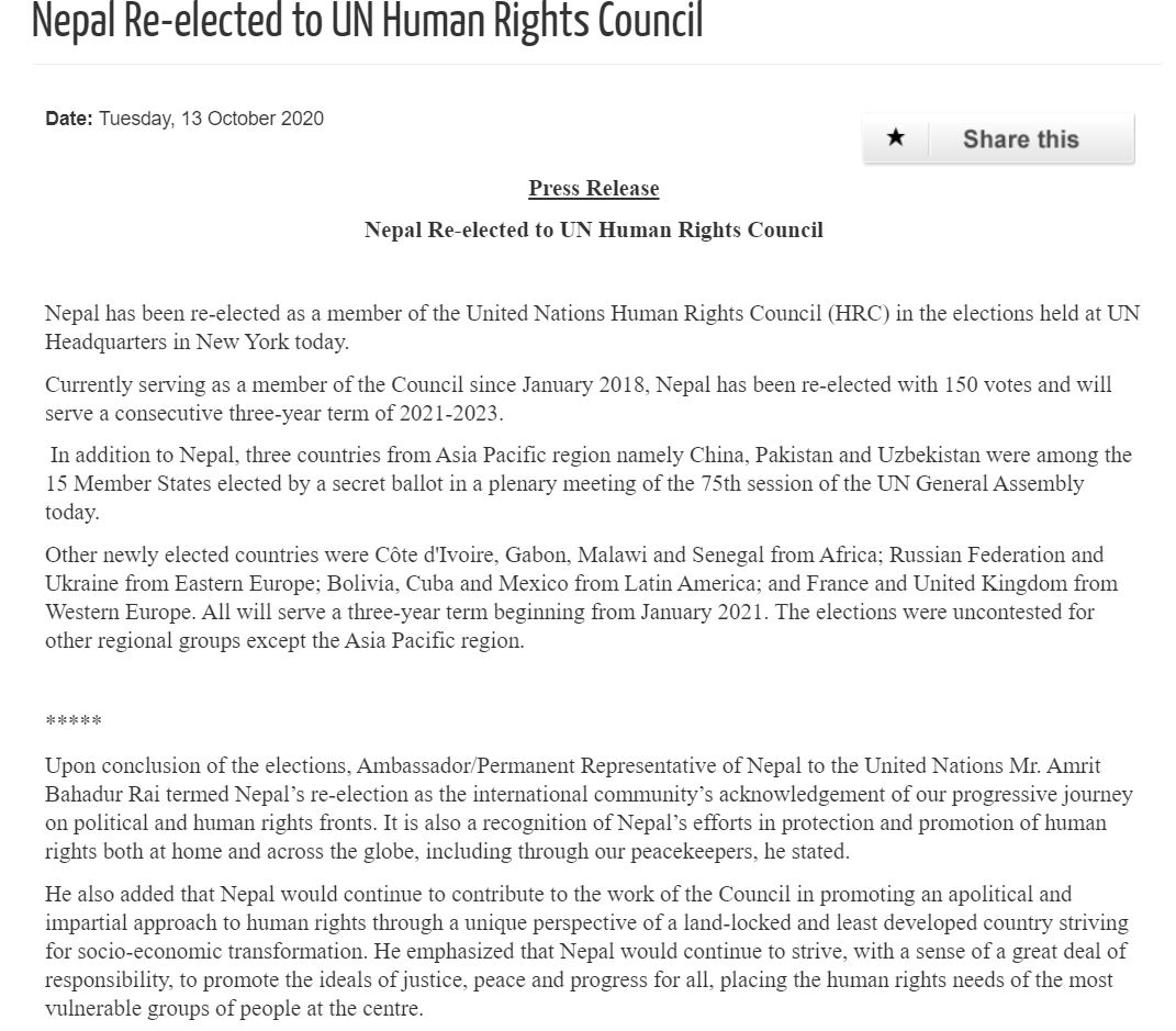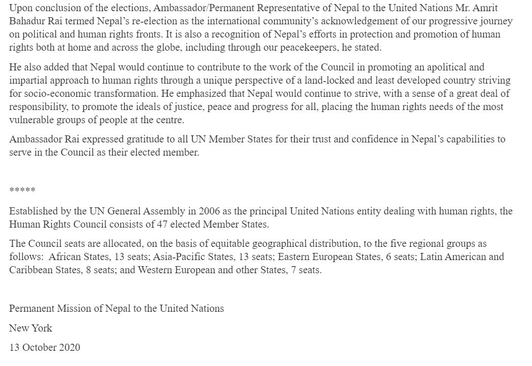 नेपाल संयुक्त राष्ट्रसंघको मानव अधिकार परिषद्को सदस्यमा पुनः निर्वाचित