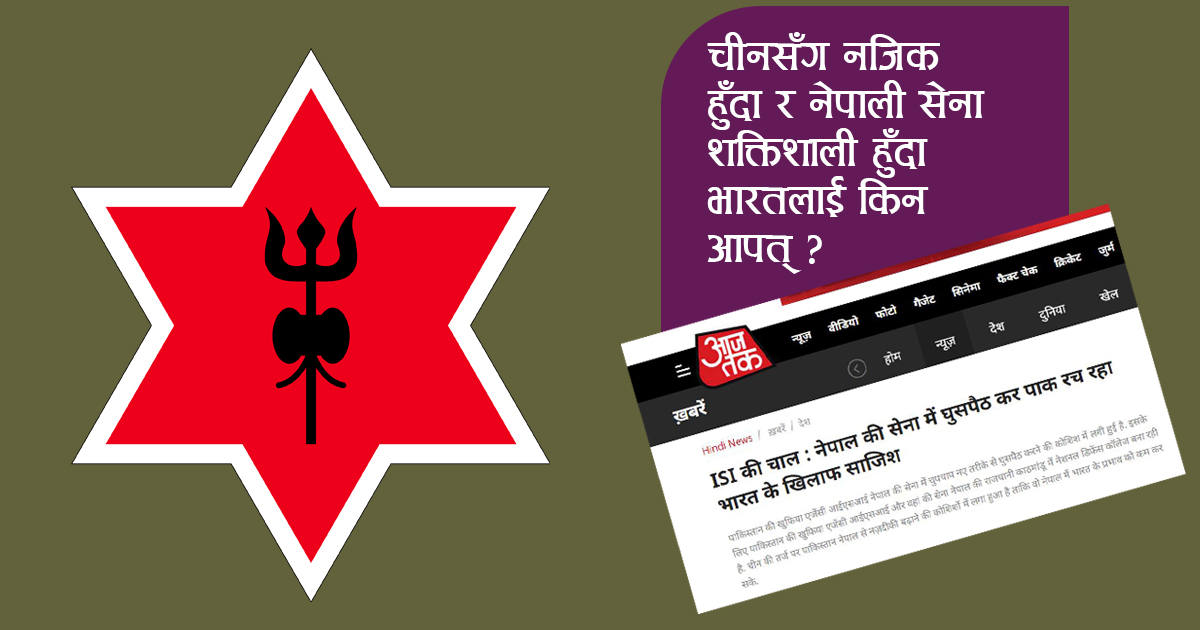 काठमाडौं –नेपाली सेनाले विभिन्न देशका सेनासँग सहकार्य र सम्बन्ध विस्तार गर्दा भारतको टाउको दुख्ने गरेको छ । भारतीय मिडियाले नेपाली सेनाबारे दुस्प्रचार गर्दै समाचार सम्प्रेषण गर्न थालेका छन् । भारतको चर्चित टेलिभिजन आजतकको अनलाइन संस्करणमा नेपाली सेनाबारे दुस्प्रचार हुने गरी भ्रामक समाचार सम्प्रेषण गरिएको छ ।