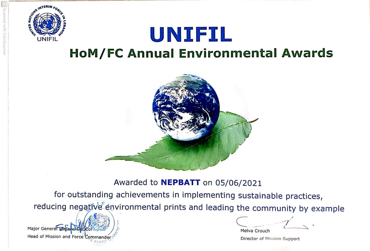 यस पुरस्कार युनिफिल मिशन ईलाकाभित्र वातावरणीय तथा पर्यावरणीय क्षेत्रमा असाधारण योगदान दिने व्यक्ति तथा सैनिक व्यारेकहरुलाई वार्षिक रुपमा प्रदान गर्दै आईरहेको छ ।