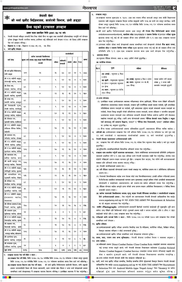 नेपाली सेनाका देशैभरि रहेका विभिन्न कार्यालयबाट भर्ना प्रक्रिया सुरू गरिने छ । १८ वर्ष पूरा भई २२ वर्ष ननाघेका नेपाली नागरिकले असोज २४ गतेसम्म आवेदन दिन सक्ने सेनाले जनाएको छ ।