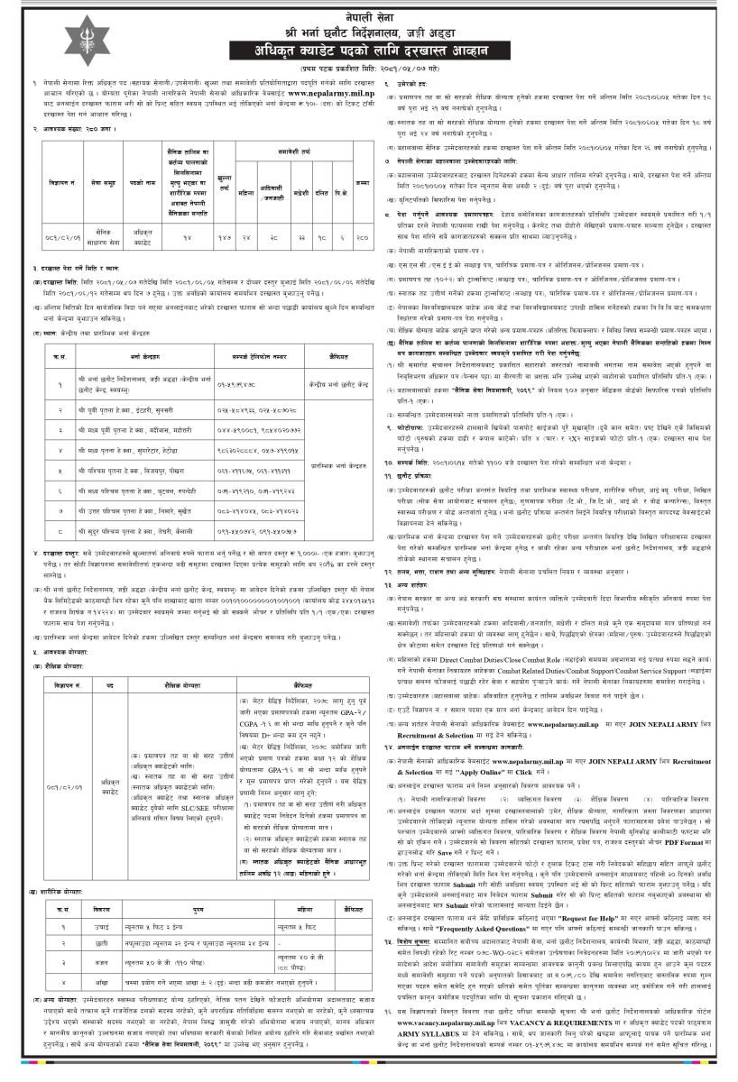नेपाली सेनाले आज एक सूचना जारी गर्दै रिक्त अधिकृत पदतर्फ (सहायक सेनानी÷उपसेनानी) खुल्ला तथा समावेशी प्रतियोगिताद्वारा पदपूर्तिका लागि दरखास्त आह्वान गरेको हो ।