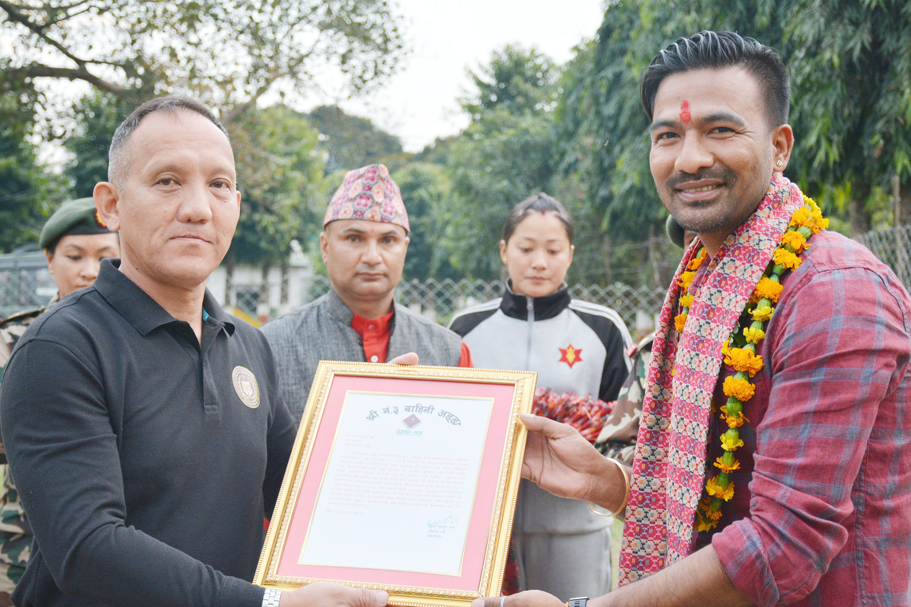 नेपाली सेना र जनताबीच सुमधुर सम्बन्ध कायम गर्न महत्वपूर्ण भूमिका खेले बापत वडाध्यक्ष श्रेष्ठलाई सम्मान गरिएको हो । तस्वीर : कृष्ण न्यौपाने/रासस