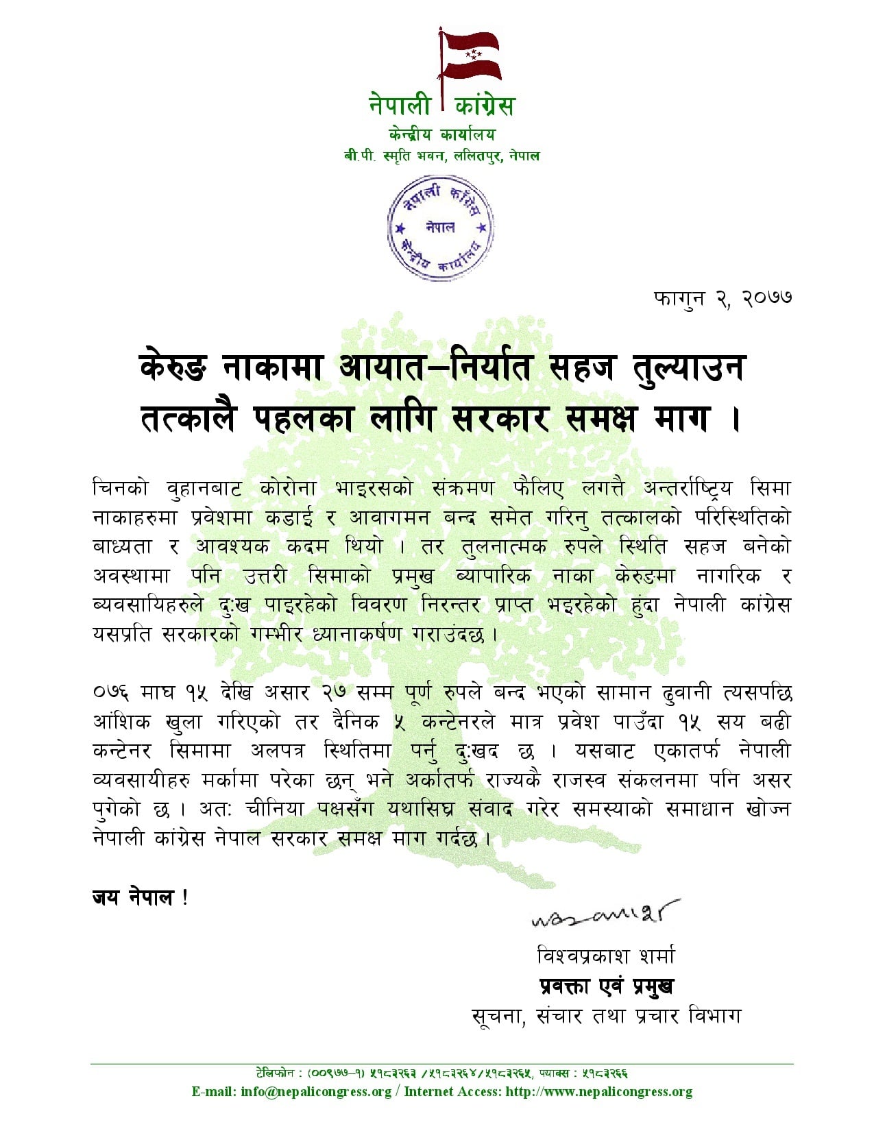 ‘चिनको वुहानबाट कोरोना भाइरसको संक्रमण फैलिए लगत्तै अन्तर्राष्ट्रिय सिमा नाकाहरुमा प्रवेशमा कडाई र आवागमन बन्द समेत गरिनु तत्कालको परिस्थितिको बाध्यता र आवश्यक कदम थियो । तर तुलनात्मक रुपले स्थिति सहज बनेको अवस्थामा पनि उत्तरी सिमाको प्रमुख ब्यापारिक नाका केरुङमा नागरिक र ब्यवसायिहरुले दुःख पाइरहेको विवरण निरन्तर प्राप्त भइरहेकोे हुंदा नेपाली कांग्रेस यसप्रति सरकारको गम्भीर ध्यानाकर्षण गराउंदछ’, उनले भनेका छन् ।
