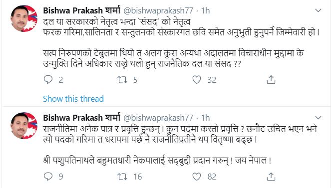 ‘दल या सरकारको नेतृत्वभन्दा संसदको नेतृत्व फरक गरिमा, शालीनता र सन्तुलनको संस्कारगत छविसमेत अनुभूति हुनुपर्ने जिम्मेवारी हो,’ उनले ट्विटमा भनेका छन्, ‘सत्य निरुपणको टेबुलमा थियो त अलग कुरा अन्यथा अदालतमा विचाराधीन मुद्दामा के उन्मुक्ति दिने अधिकार राख्ने थलो हुन् राजनीतिक दल या संसद ?’