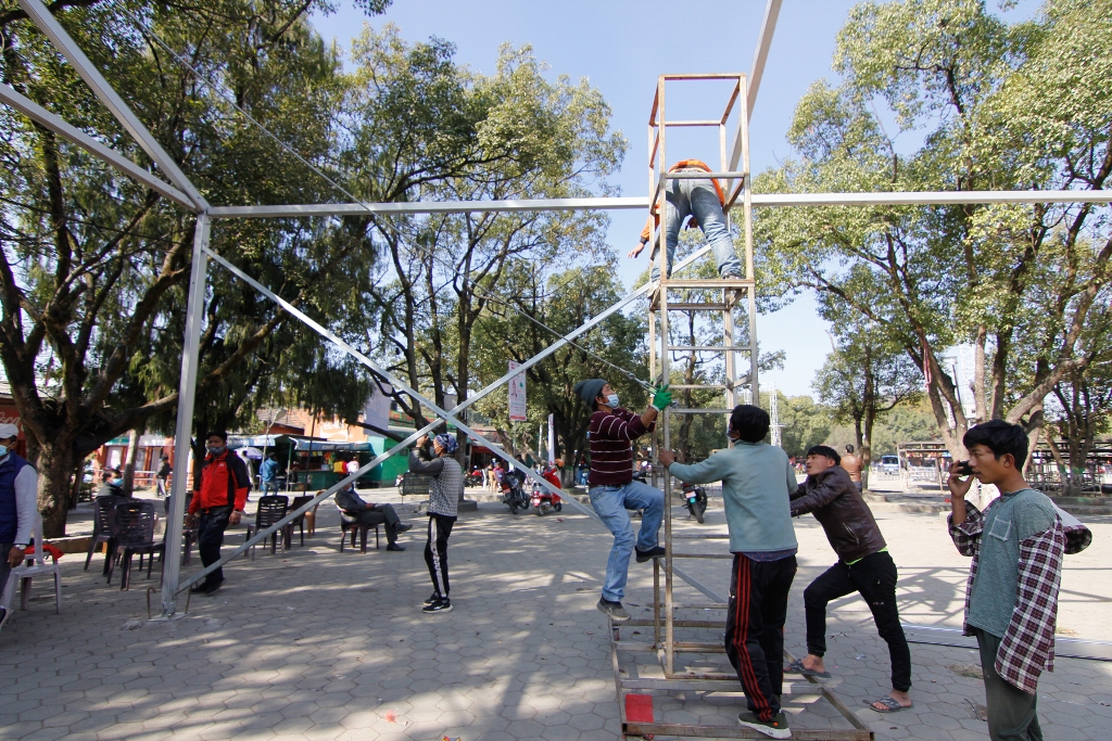 ‘हामीले सिंगार्न थालेको, स्टेज बनाउन थालेको तीन दिन भयो । दिनको २०(२२ घन्टासम्म ३५ जना कामदारले काम गरिरहेका छन्’, रोशन आर्टस् सर्भिसका प्रोपाइटर रोशन जैसवालले भने ।