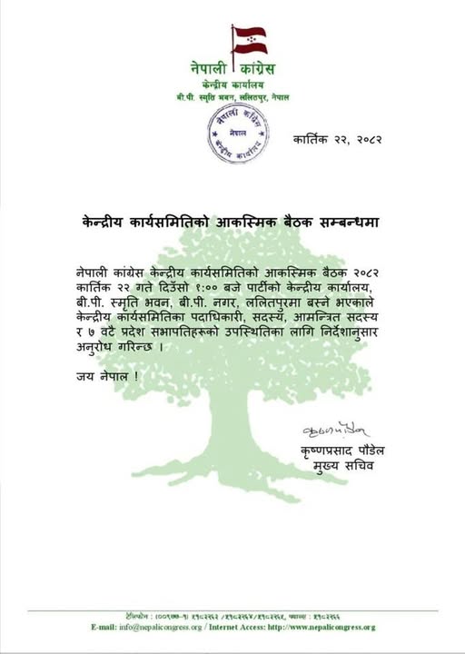 काठमाण्डु – नेपाली कांग्रेसले केन्द्रीय कार्यसमितिको आकस्मिक बैठक बोलाएको छ ।