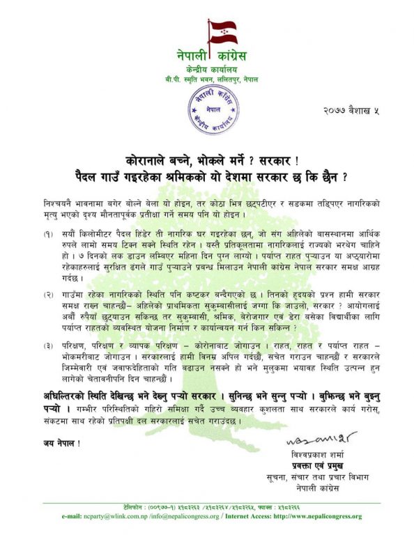 काठमाडौं – प्रमुख प्रतिपक्षी दल नेपाली कांग्रेसले पैदल गाउँ गइरहेका श्रमिकको उचित व्यवस्थापन गर्न माग गरेको छ ।