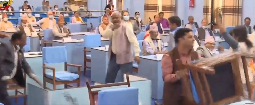 मन्त्रीले उक्त प्रस्ताव पेश गरेसँगै कांग्रेस सांसदले कुर्सी उचालेर भाँचेका थिए । सांसदहरुले टेबुल र कर्सी भाँचेका छन् भने माइक पनि तोडफोड गरेका छन् ।