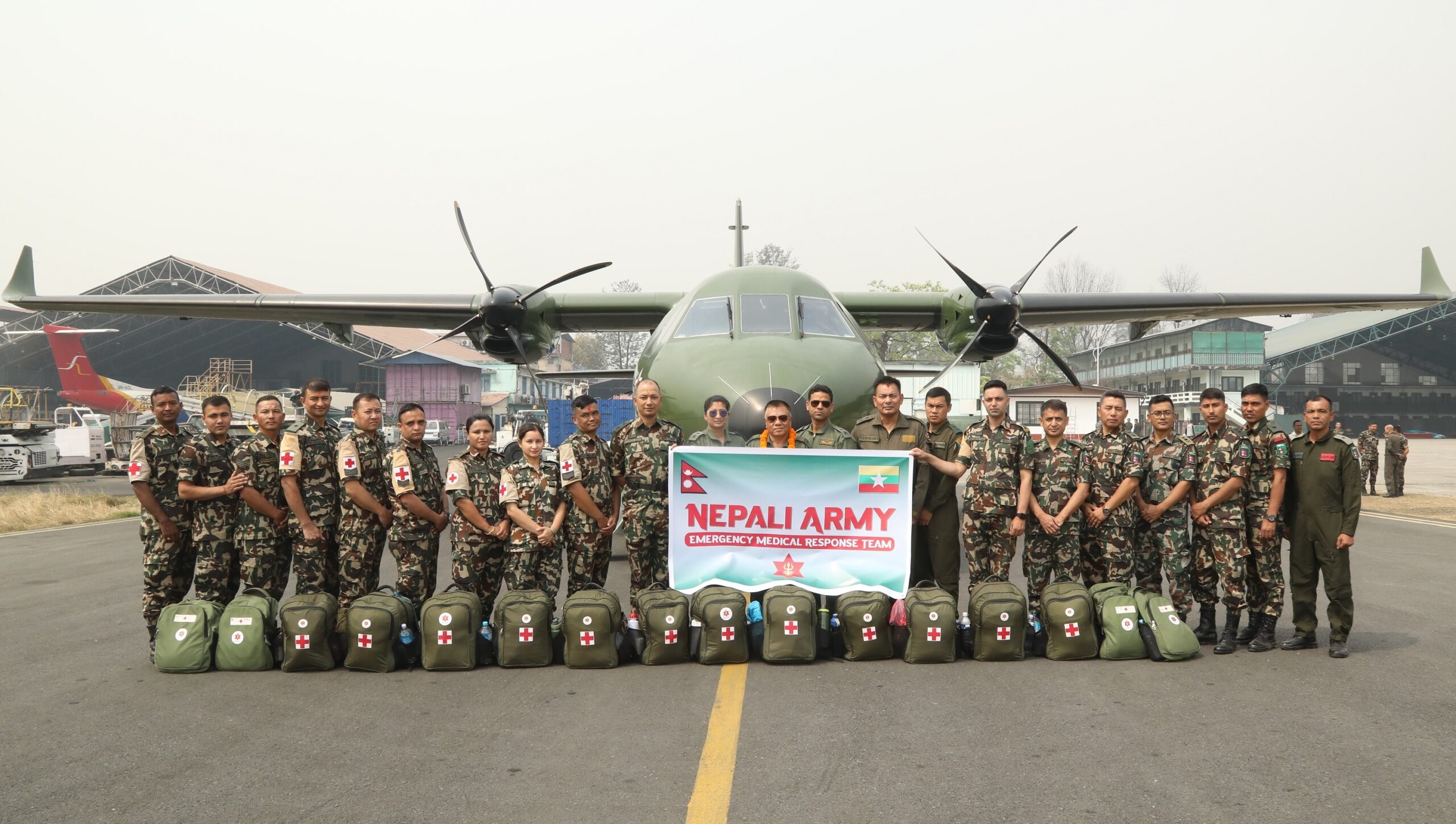 प्रमुख सेनानी रामचन्द्र श्रेष्ठको नेतृत्वमा १२ जना चिकित्सकीय टिम, ४ जना बन्दोबस्ती सहायता टिम र ६ जना क्रु मेम्बर सहित कुल २२ सदस्यीय टोली नेपाली सेनाको CN-235 CASA विमानद्वारा म्यानमार प्रस्थान गरेको हो ।