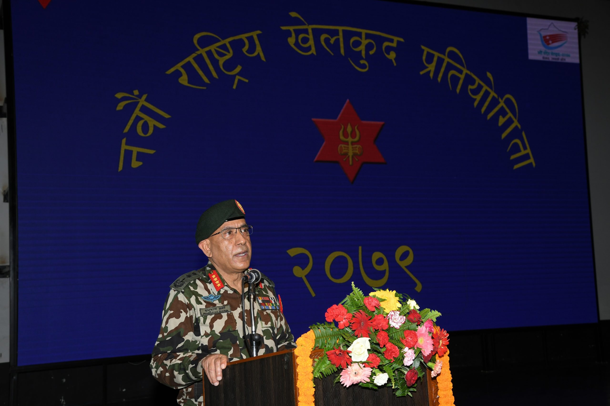 त्यस्तै प्रधानसेनापति शर्माले खेलकुदका माध्यमबाट समग्र नेपाली सेनाको प्रतिनिधित्व गर्दै नियमित रुपमा आम नागरिकहरुसँग सम्पर्कमा रहने सम्पूर्ण नेपाली सेनाका प्रशिक्षक तथा खेलाडीहरु नागरिक-सैनिक सम्बन्ध विस्तारको महत्त्वपूर्ण सेतुका रुपमा स्थापित रहेको उल्लेख गर्दै सम्पूर्ण खेलाडीहरुलाई आसन्न राष्ट्रिय खेलकुदका क्रममा जुनसुकै प्रतिष्पर्धामा सहभागी हुँदा सबै भन्दा पहिला म नेपाली सेनाको सदस्य हुँ र त्यसपछि मात्र खेलाडी हुँ भन्ने कुरालाई आत्मसात गर्दै नेपाली सेनाको मर्यादित र अनुशासित सदस्यको उदाहरणका रुपमा प्रस्तुत हुन समेत निर्देशन दिए ।