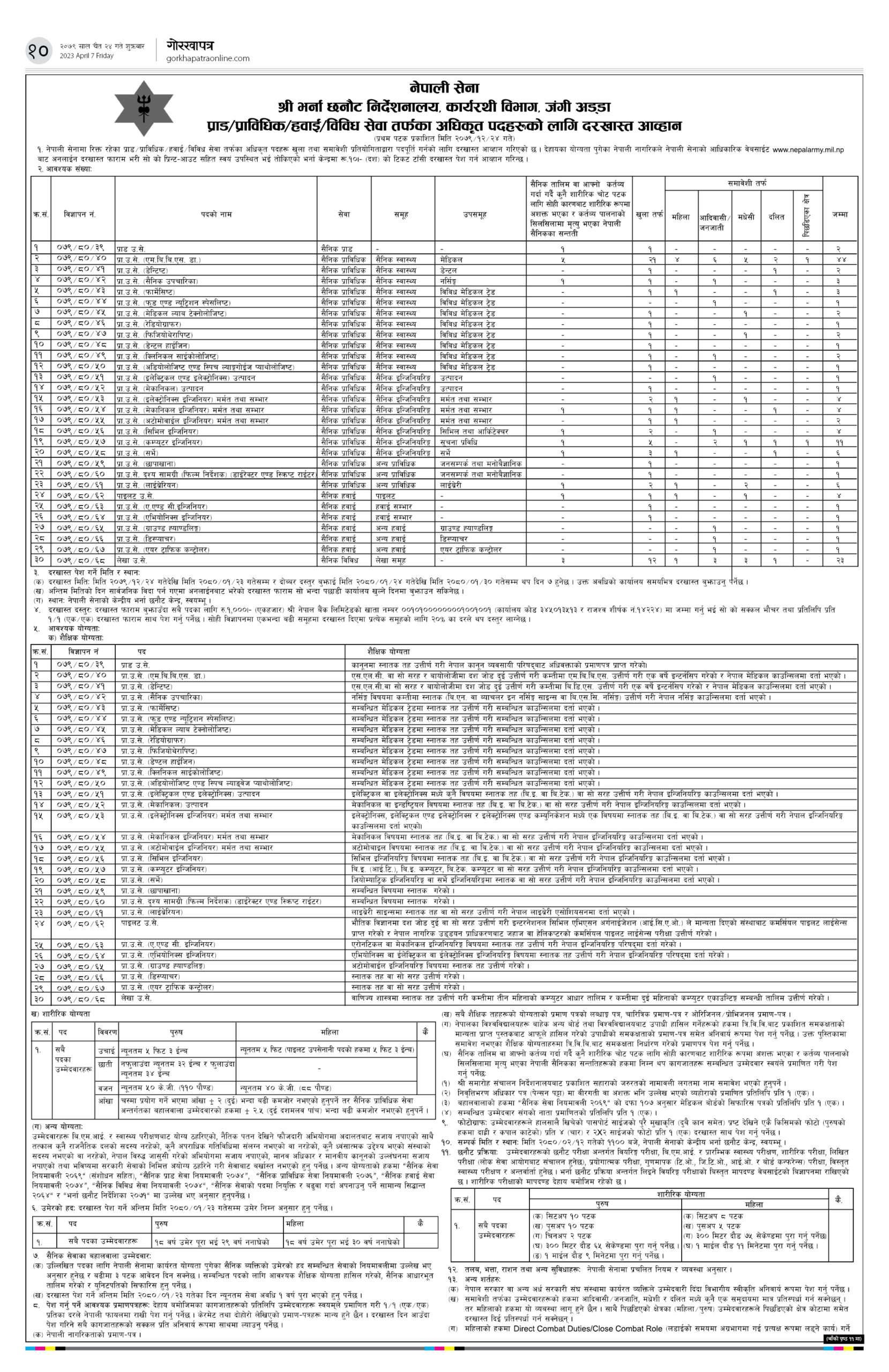 आज गोरखापत्रमा सूचना निकालेर सेनाको भर्ना छनौट निर्देशनालय, कार्यरथी विभाग जंगी अड्डाले उपसेनानी, एमबिबिएस डाक्टर, फार्मेसिष्ट, फिल्म निर्देशक, सिभिल इन्जिनियर, एयर ट्राफिक कन्ट्रोलरलगायत विभिन्न ३० पदका लागि दरखास्त आह्वान गरेको हो ।