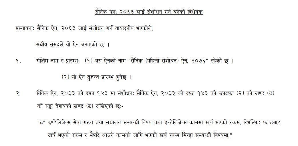 सेनालाई थप शक्तिशाली बनाउन र सरकारलाई कानुन बनाउने अधिकार थप्ने गरी हाल सैनिक ऐन २०६३ मा पहिलो संशोधन गर्न लागिएको छ । प्रतिनिधि सभाको मंगलबारको बैठकमा रक्षामन्त्री ईश्वर पोखरेलले सैनिक ऐन २०६३ लाई संशोधन गर्न बनेको सैनिक (पहिलो संशोधन) विधेयक २०७६ पेश गरे ।