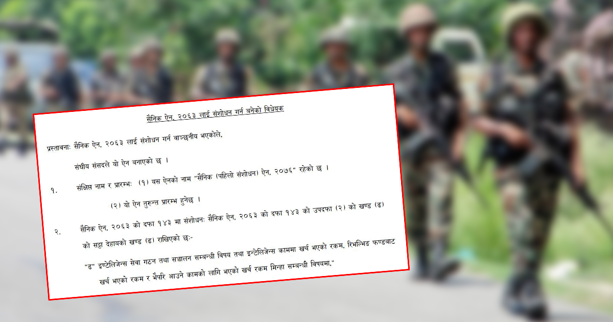 नेपाली सेनालाई विशेष अधिकार थप्दै ‘शक्तिशाली’ बनाउने गरी सैनिक ऐनमा संशोधन गर्न लागिएको छ । मंगलवार दर्ता भएको सैनिक ऐनमा मुख्यगरी ‘इण्टेलिजेन्ट सेवा गठन र सञ्चालन सम्बन्धी विषय’ छ ।