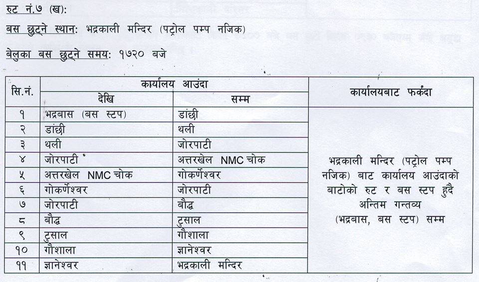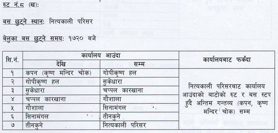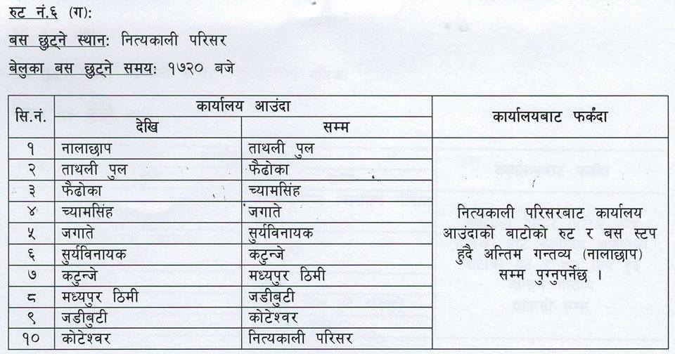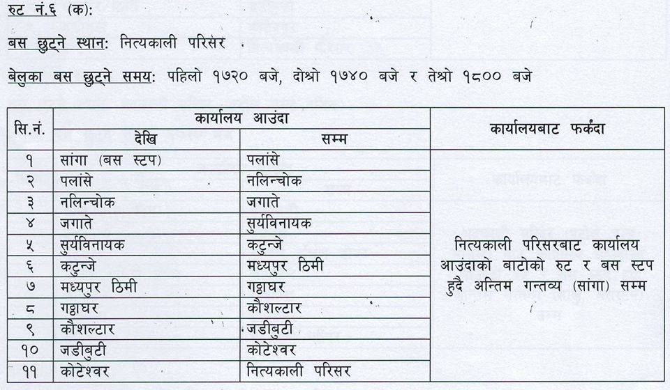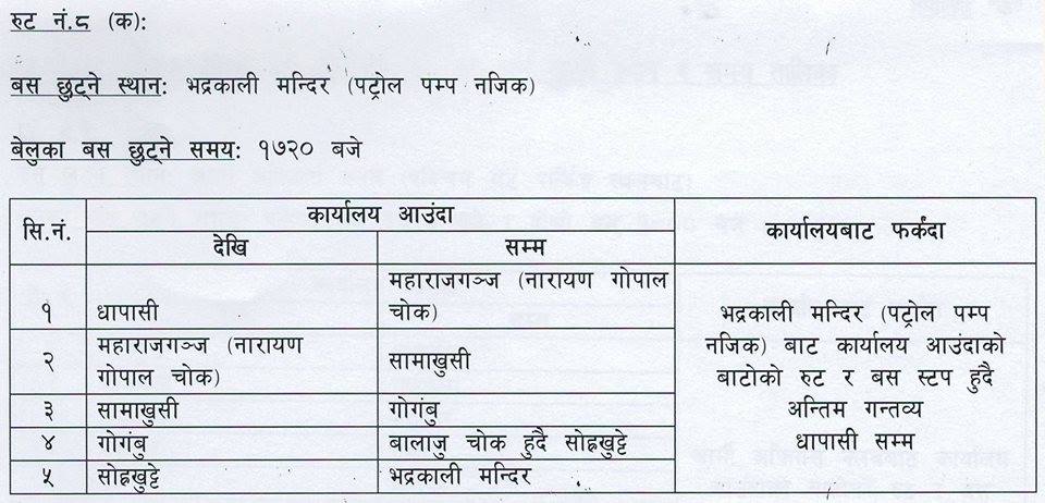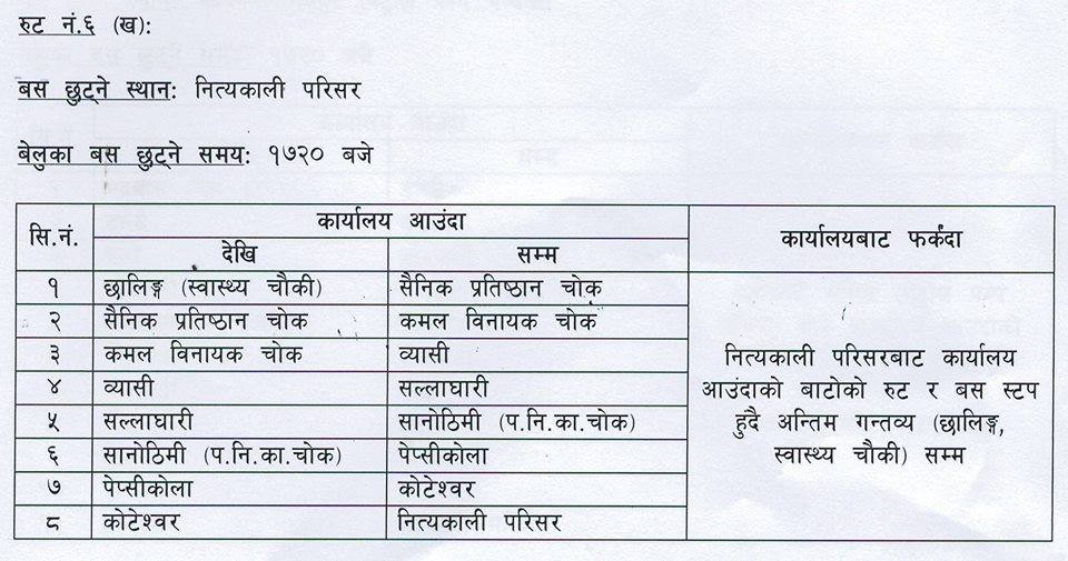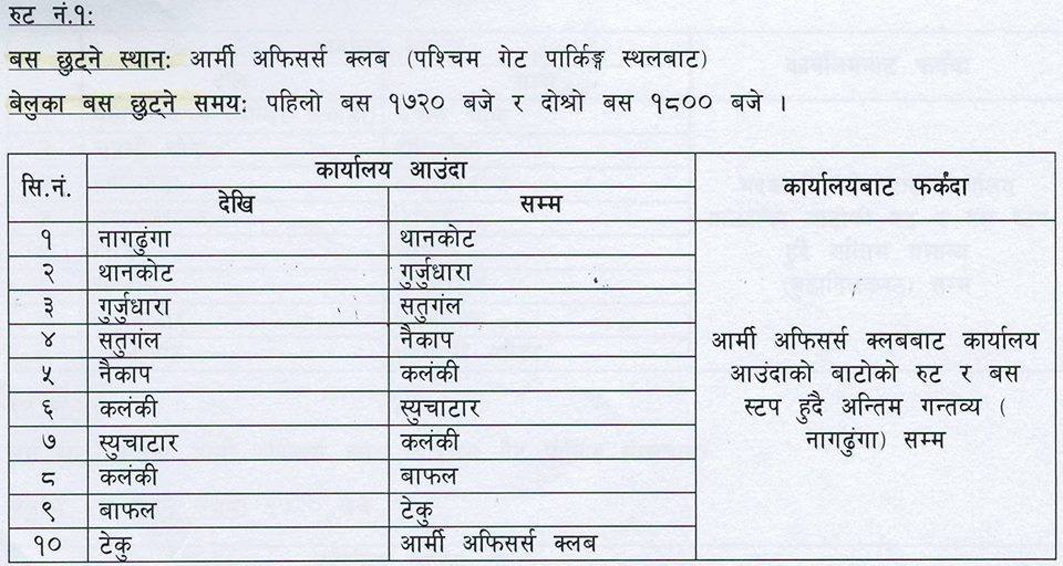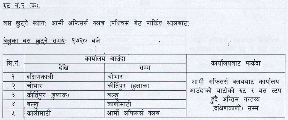 उपत्यकाभित्र विभिन्न १४ वटा रुटहरुमा २ गतेदेखि हरेक दिन बिदाको दिन बाहेक ८ बजे प्रत्येक रुटको अन्तिम गन्तव्यबाट सटल बस छुट्ने व्यवस्था मिलाइएको जनसम्पर्क तथा सूचना निर्देशनालयले जनाइको छ । सटल बसहरु प्रयोग गर्ने स्टाफहरुसँग अनिवार्यरुपमा सैनिक परिचय–पत्र भने साथमा हुनुपर्नेछ।