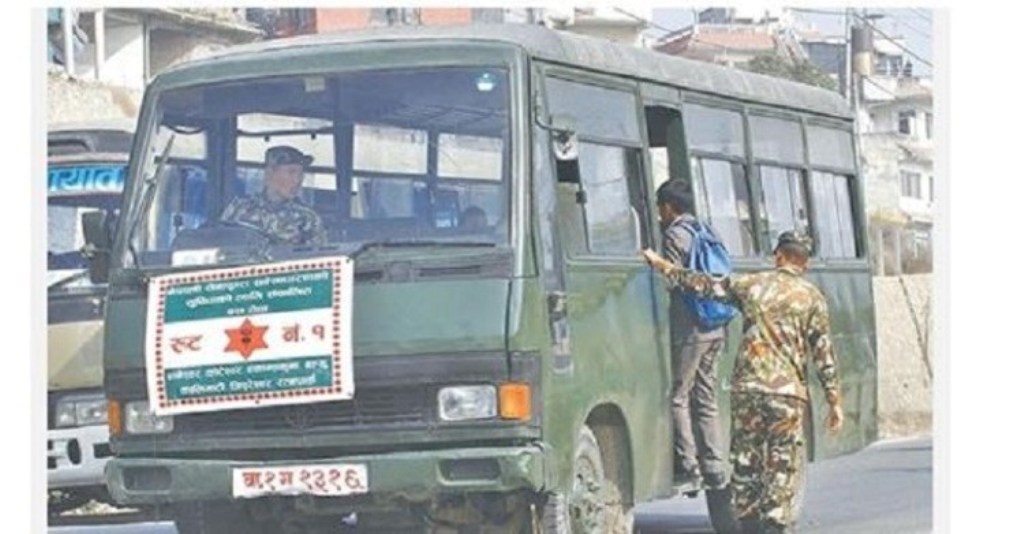 काठमाडौं – सैनिक मुख्यालय जंगी अड्डामा कार्यरत सैनिकलाई आफ्नो बासस्थानदेखि कार्यालयसम्म आउन जान नेपाली सेनाले बस सञ्चालन गरेको छ।
