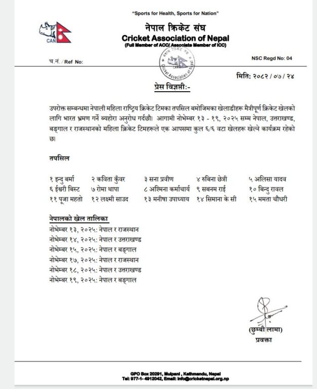नेपाल क्रिकेट संघ क्यानले सोमबार महिला राष्ट्रिय क्रिकेट टोलीले उक्त सिरिज खेल्ने जानकारी दिएको हो। सो सिरिजका लागि १५ खेलाडीको घोषणा भएको छ।