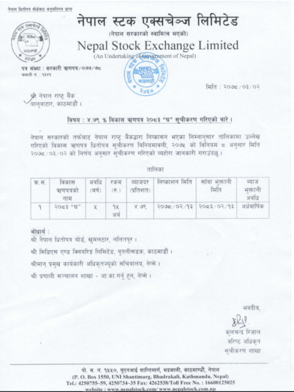 नेपाल राष्ट्र बैंकले २०७८ साल जेठ १३ मा निष्कासन गरेको २०८३ ’घ’ नामको ५ वर्ष अवधिको १५ अर्ब रूपैयाँ बराबरको विकास ऋणपत्र सूचिकृत भएको हो । यसबारे नेप्सेले एक सूचना जारी गर्दै जानकारी दिएको छ ।