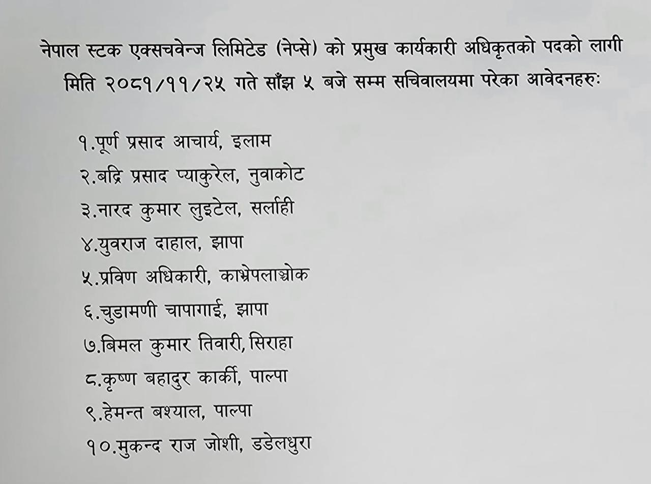अर्थ मन्त्रालयका अनुसार नेप्सेको सीईओका लागि आईतबारसम्म पूर्णप्रसाद आचार्य, बद्रीप्रसाद प्याकुरेल, नारदकुमार लुइँटेल, युवराज दाहाल, प्रविण अधिकारी, चुडामणि चापागाईं, विमलकुमार तिवारी, कृष्णबहादुर कार्की, हेमन्त बश्याल र मुकन्दराज जोशीले आवेदन दिएका छन् ।