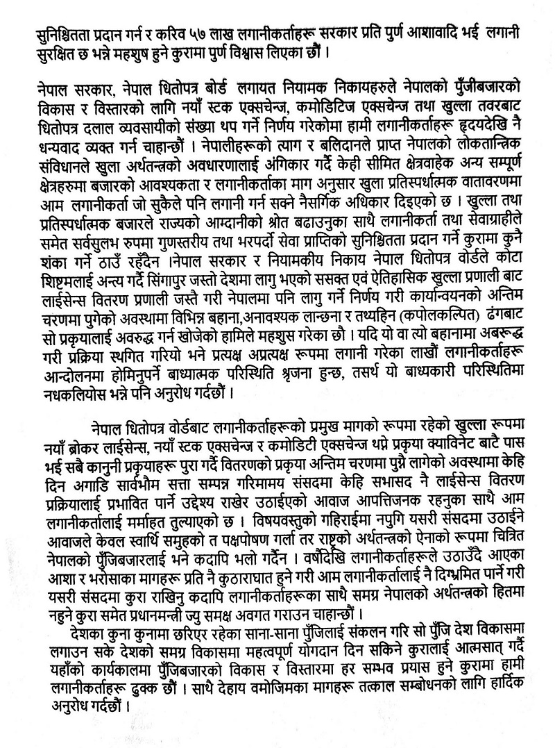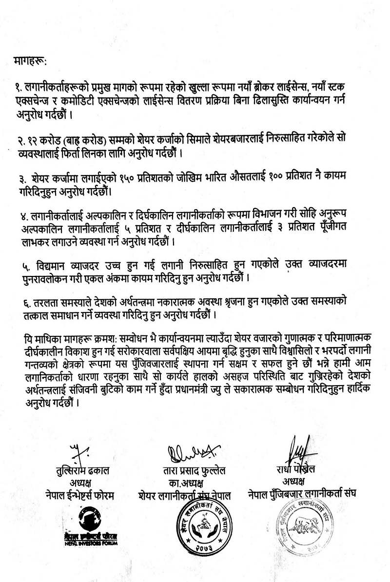 नेपाल इन्भेस्टर्स फोरमका अध्यक्ष तुलसीराम ढकाल, सेयर लगानीकर्ता संघका कार्यबाहक अध्यक्ष तुलसीराम ढकाल, सेयर लगानीकर्ता संघका कार्यबाहक अध्यक्ष ताराप्रसाद फुल्लेल र नेपाल पुजींबजार लगानीकर्ता संघकी अध्यक्ष राधा दाहालले प्रधानमन्त्रीलाई भेटेर तुरुन्त नयां स्टक र ब्रोकर लाइसेन्सको प्रक्रिया अघि बढाउन माग गरेका हुन् ।