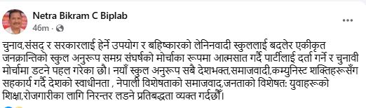 बुधवार सामाजिक सञ्जाल फेसबुकमार्फत उनले आफ्नो धारणा सार्वजनिक गर्दै पार्टीले राजनीतिलाई हेर्ने दृष्टिकोणमा परिवर्तन ल्याएको बताए। उनले पुरानो स्कुलको विस्थापन गर्दै चुनाव, संसद् र सरकारलाई हेर्ने उपयोग र बहिष्कारको लेनिनवादी स्कुललाई परिवर्तन गरेको उल्लेख गरेका छन्।