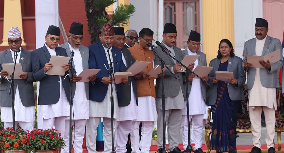 प्रधानमन्त्री ओलीसहित २ उपप्रधानमन्त्री र १९ मन्त्रीले राष्ट्रपति रामचन्द्र पौडेलसमक्ष पद तथा गोपनियताको शपथ लिएका छन् । ती मध्य दुई दलका गरी ११ सांसद पहिलो पटक मन्त्री बनेका हुन् । २२ सदस्यीय मन्त्रिपरिषद्मा नयाँ मन्त्री बन्नेको संख्या ठ्याक्कै आधा देखिन्छ ।