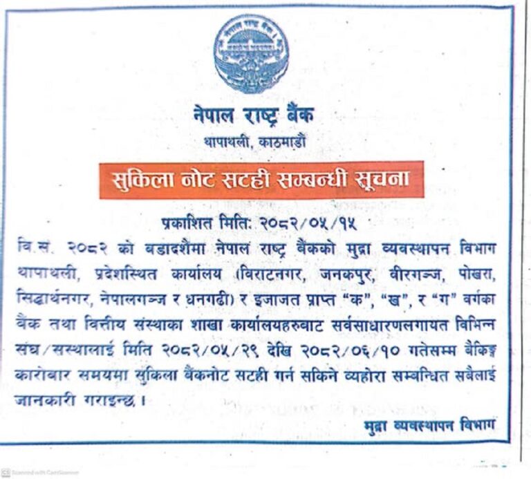 राष्ट्र बैंकले आइतबार सूचना जारी गर्दै यस्तो जानकारी दिएको हो।