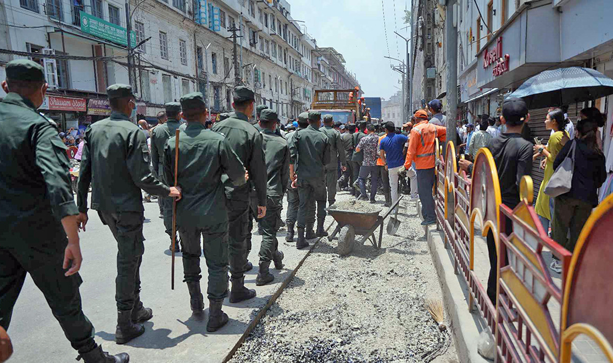 काठमाण्डु-उच्च अदालतको आदेशपछि काठमाडौँ महानगरपालिकाले न्युरोडमा फुटपाथ विस्तारको कामलाई निरन्तरता दिएको छ । महानगरपालिकाले पैदल मार्गलाई फराकिलो बनाउने काम बुधबार बिहानदेखि सुरु गरेको हो ।