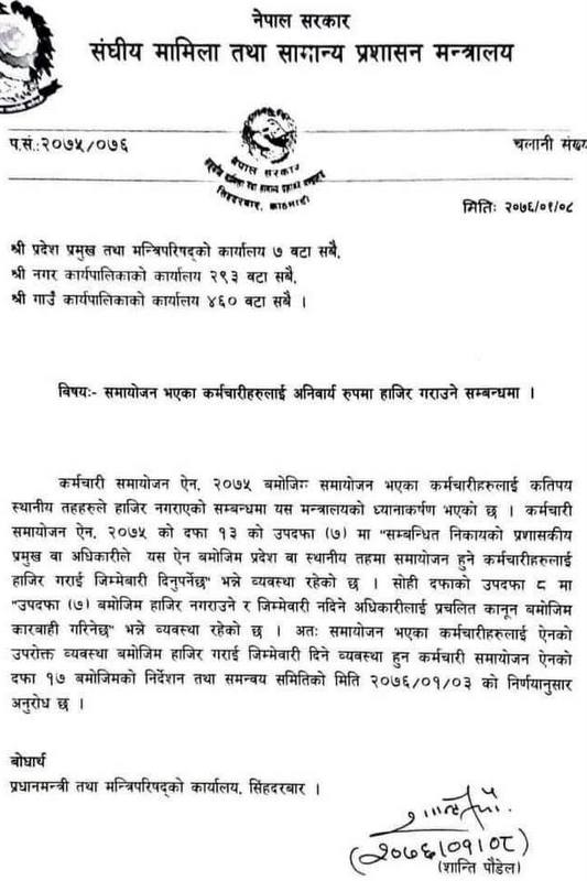 मन्त्रालायले कर्मचारी समायोजन ऐन, २०७५ बमोजिम समायोजन भएका कर्मचारीलाई अनिवार्य हाजिर हुन भनेको हो। कतिपय स्थानीय तहहरूले हाजिर नगराई फिर्ता पठाएपछि सबै प्रदेश प्रमुख, नगर कार्यपालिका र गाउँपालिकाको कार्यालयलाई अनिवार्य रूपमा हाजिर गराउन पत्र पठाएको कर्मचारी प्रशासन महाशाखाका प्रमुख सहसचिव रुद्रसिंह तामाङले जानकारी दिए।