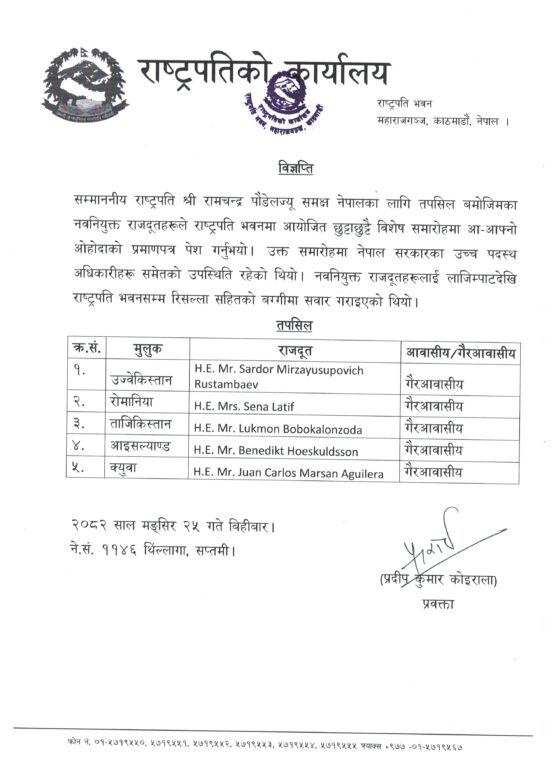 काठमाण्डु – राष्ट्रपति रामचन्द्र पौडेलसमक्ष नेपालका लागि नवनियुक्त ५ जना राजदूतहरूले आ–आफ्नो ओहोदाको प्रमाणपत्र पेश गरेका छन् ।