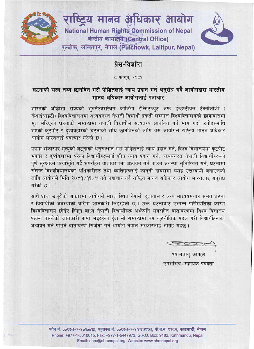 काठमाण्डु – भारतको ओडिशा भुवनेश्वरस्थित कालिंगा इन्सिटच्युट अफ इन्डस्ट्रियल टेक्नोलोजी (केआईआईटी) कीट विश्वविद्यालयमा नेपाली विद्यार्थी प्रकृति लम्सालको मृत्यु र अन्य विद्यार्थीमाथि भएको दुर्व्यहारबारे राष्ट्रिय मानवअधिकार आयोगले भारतलाई पत्राचार गरेको छ ।