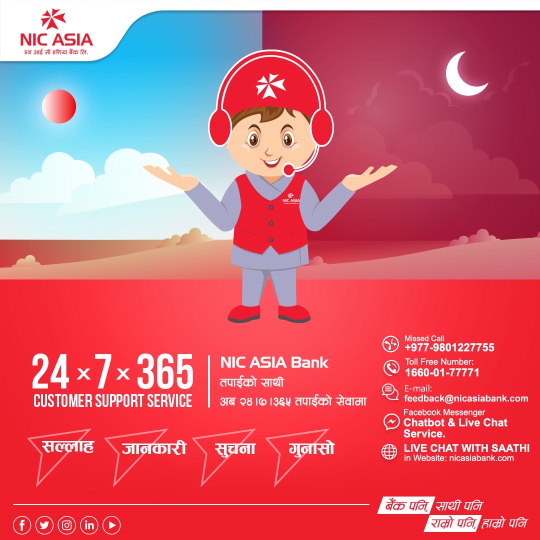 काठमाडौं – आफ्ना ग्राहक महानुभावहरुलाई गुणस्तरिय बैंकिङ्ग सेवा प्रदान गर्दै आइरहेको यस एन आई सी एशिया बैंकले अझै आधुनिक र प्रतिस्पर्र्धी सेवा दिने क्रममा विगत वि.सं. २०७१ साल देखि सञ्चालनमा रहेको ग्राहक सपोर्ट सेवालाई २४ सै घण्टा सञ्चालनमा ल्याएको सहर्ष जानकारी गराउँदछौं ।