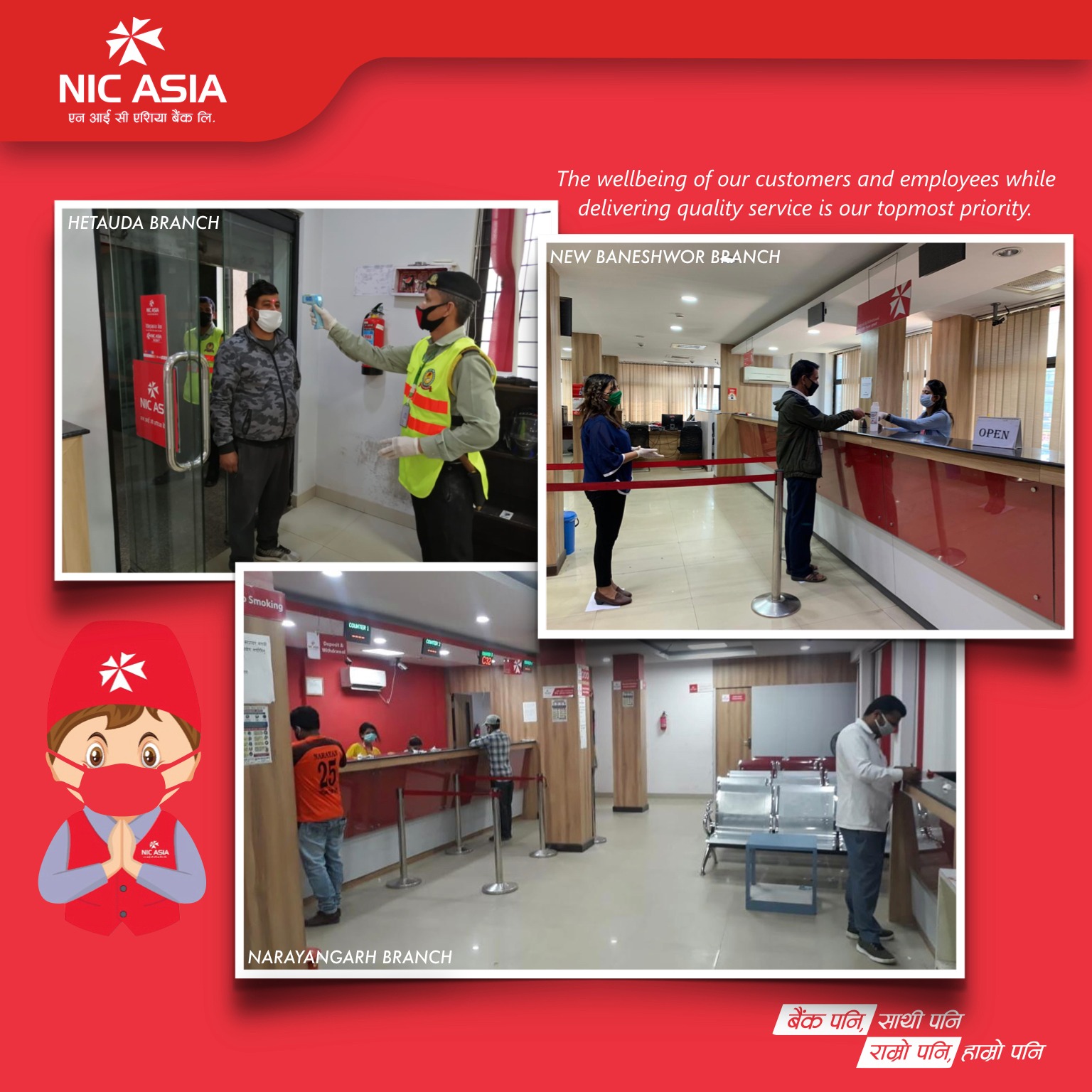 शाखा कार्यालयहरूमा कोरोना भाइरसको संक्रमणबाट सावधानी तथा सुरक्षित रहनको लागि जनचेतनामूलक सूचना राखिएको । ग्राहक महानुभावहरूको बैंकिङ्ग कार्यमा समस्या आएको खण्डमा सो को समाधानका लागि बैंकले ‘डिजिटल हेल्प डेस्क’ तथा प्रादेशिक तथा उपप्रादेशिक क्षेत्रमा ‘ग्राहक सहायता केन्द्र’ को समेत स्थापना गरेको ।