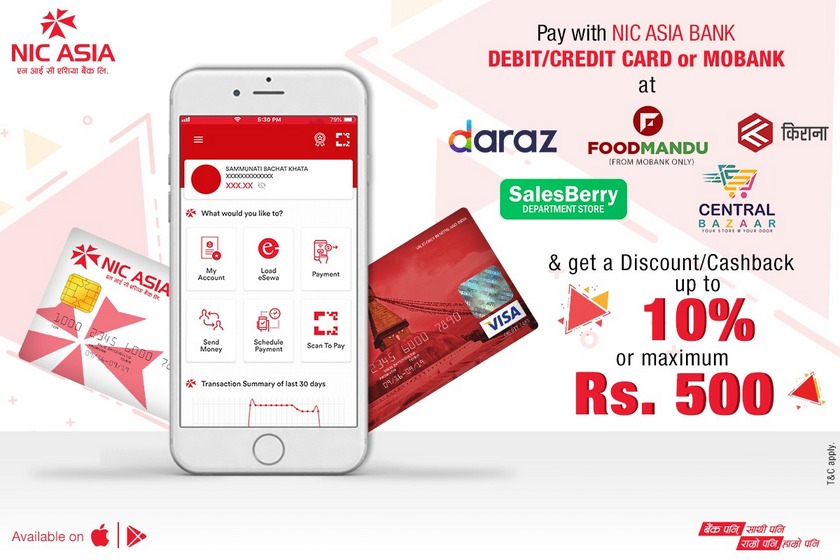 काठमाडौं- एनआईसी एशिया बैंक लिमिटेडका ग्राहकहरूलाई नेपालका विभिन्न अनलाइन डेलिभरीका माध्यमहरूबाट सामान खरिद गर्दा लकडाउन अवधिभर खरिद रकमको १० प्रतिशत वा अधिकतम ५०० सम्म छुट हुने भएको छ ।
