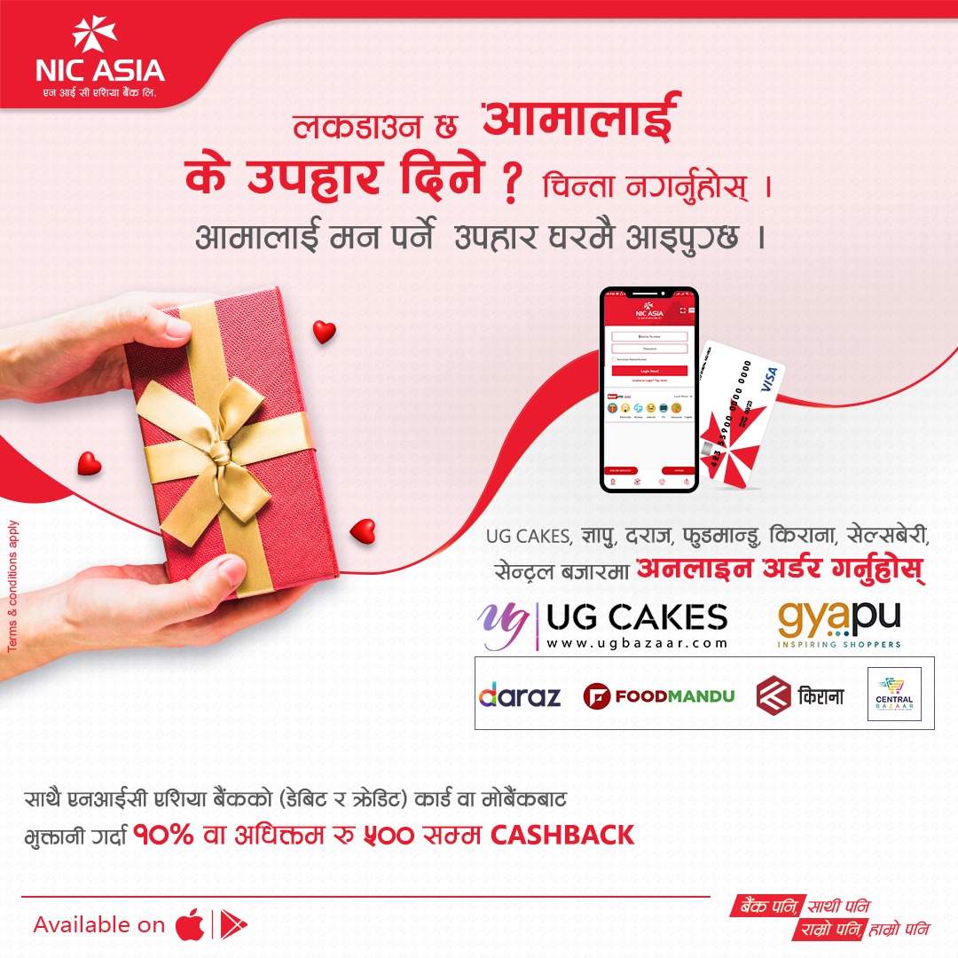 आमाको मुख हेर्ने दिन केक उपहार अनलाईन खरिद गर्दा एनआईसी बैंकका ग्राहकलाई १०% नगद फिर्ता