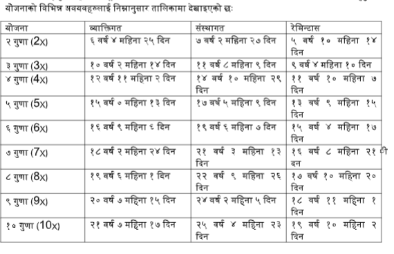 यो योजनामा निक्षेपकर्ताले ५ वर्ष १० महिना देखि १९ वर्ष १० महिनासम्म मुद्दती खातामा रकम जम्मा गरे अनुसार डबल देखि १० गुणा सम्म निक्षेप रकम फिर्ता पाउनेछन् । निक्षेपकर्ताले आफूले निक्षेप गरेको रकमको ८० प्रतिशत बराबर रकम कर्जा समेत लिन सक्ने पनि बैंकले जनाएको छ ।