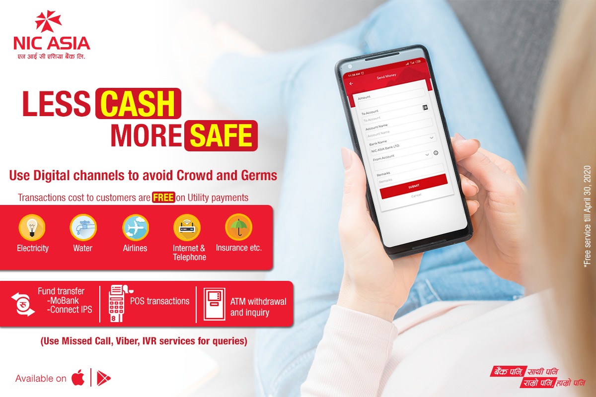 काठमाडौँ – कोरोना भाइरस (कोभिड-१९) महामारीको जोखिम न्यूनिकरणका लागि नेपाल सरकारले गरेको रोकथाम तथा नियन्त्रणको प्रयासलाई टेवा पु¥याउने उद्देश्यले एनआईसी एशिया बैंक लिमिटेडले इन्टरनेट तथा मोबाइल बैंकिङ्ग लगायतका विद्युतिय माध्यमबाट गरिने भुक्तानीका सबै सेवाहरू निःशुल्क गरेको छ ।