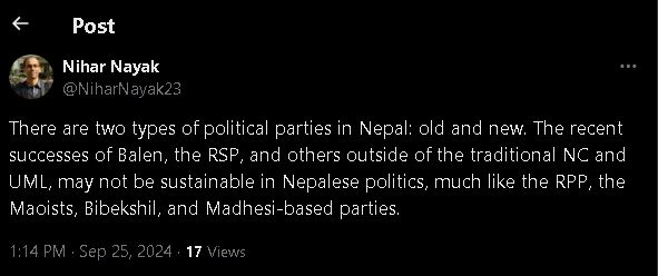 काठमाण्ड-नेपाल–भारतका जानकार निहार नायकले नेपालमा पुराना र नयाँ गरी दुई प्रकारका राजनीतिक दल रहेको बताएका छन् । उनले नेपालको पछिल्लो राजनीति दिगो नहुने आशंका व्यक्त गरेका छन् ।