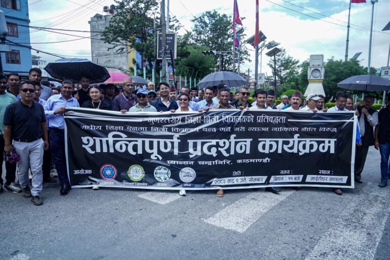 काठमाण्डु– प्याब्सन, नेशनल प्याब्सन, हिसान र अपेनले गुणस्तरीय शिक्षा–निजी विद्यालयको प्रतिबद्धता संघीय शिक्षा ऐनमा निजी विद्यालय बन्द गर्ने गरी ल्याउन लागिएको नीतिका विरुद्ध शान्तिपूर्ण प्रदर्शन गरेका छन् । उनीहरुले सोमबार माइतीघर मण्डलामा भेला भई प्रदर्शन गरेका हुन् ।
