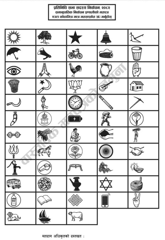 समानुपातिक तर्फको मतपत्रमा ५८ दलको चुनाव चिह्न छन्। ५४ दलले आफ्नो निर्वाचन चिह्न र १० वटा दलले विभिन्न ४ वटा चुनाव चिह्न लिएर समानुपातिक निर्वाचनमा भाग लिन लागेका हुन्।