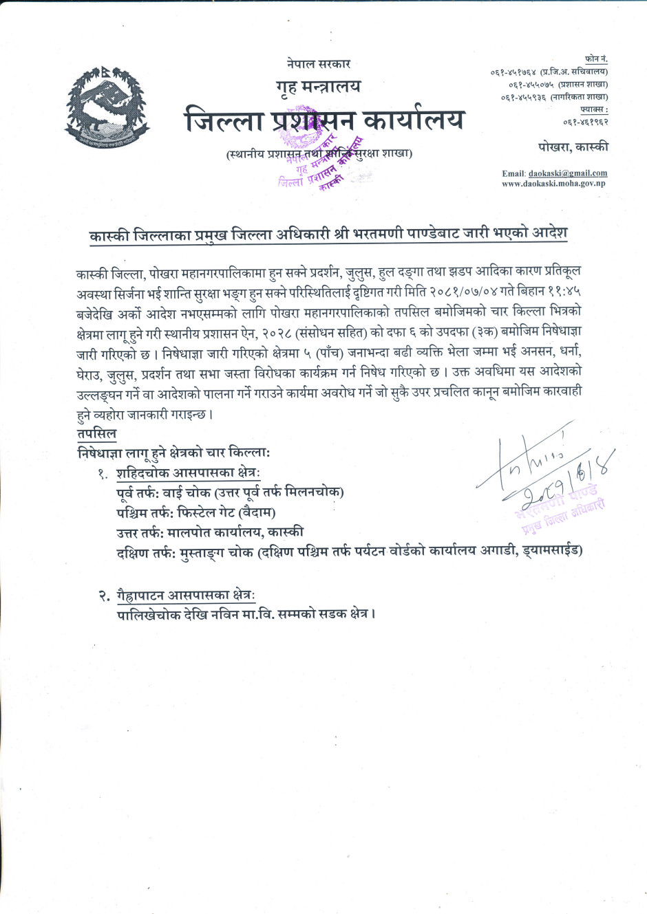 कास्कीका प्रमुख जिल्ला अधिकारी भरतमणि पाण्डेले सहिद चोक र गैह्रापाटन आसपासमा अर्को सूचना जारी नभएसम्मका लागि निषेधाज्ञा जारी गरेका हुन् ।