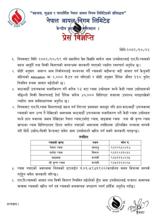 नेपाल आयल निगमले एलपी ग्यासको आयात तथा वितरण नियमित रूपमा भइरहेको हुँदा उपभोक्तालाई तत्काल आवश्यक मात्रामा ग्यास खरिद गर्न र अनावश्यक भण्डारण नगर्न आग्रह गरेको छ ।