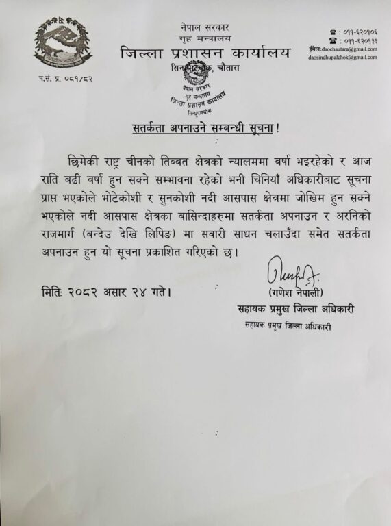 सहायक प्रमुख जिल्ला अधिकारी गणेश नेपालीले सूचना प्रकाशित गर्दै भोटेकोशी र सुनकोशी नदी आसपास क्षेत्रमा जोखिम हुनसक्ने भएकाले सतर्कता अपनाउन आग्रह गरिएको छ ।