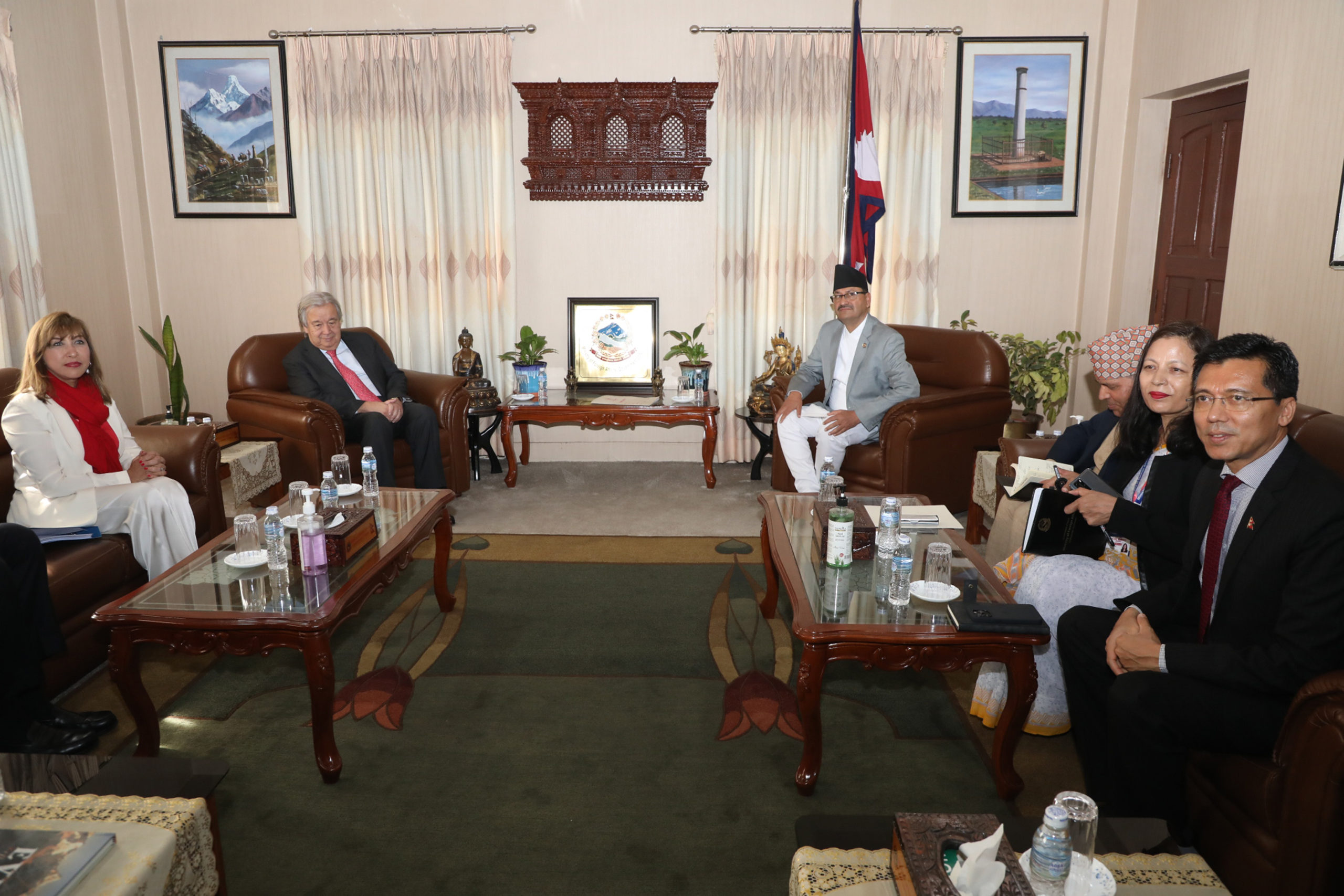आइतबार दिउँसो सिंहदरबारस्थित परराष्ट्र मन्त्रालयमा उनीहरूबीच शिष्टाचार भेटवार्ता भएको हो । महासचिव गुटरेस आइतबार राति नेपाल आएका थिए ।