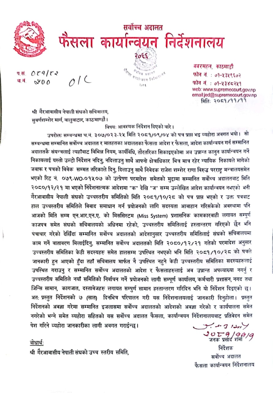 काठमाण्डु – सर्वोच्च अदालतको परमादेशको ७ दिनभित्र कार्यान्वयन गर्न सचेत गराउँदै सर्वाेच्च अदालतको फैसला कार्यान्वयन निर्देशनालयले गैरआवासीय नेपाली संघ (एनआरएनए) लाई पत्राचार गरेको छ ।