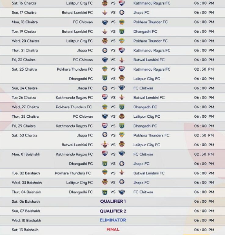 लिगको उद्घाटन खेलमा चैत १६ गते साविक विजेता ललितपुर सिटी एफसी र पहिलो संस्करणको विजेता काठमाडौं रेजर्सले खेल्ने भएका छन् ।