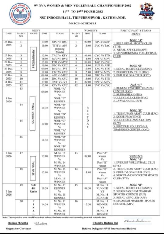 काठमाण्डु – नवौँ एनभिए भलिबल च्याम्पियनसिपको खेल तालिका सार्वजनिक भएको छ।